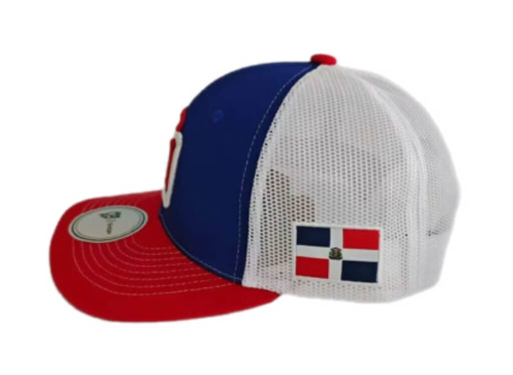 Dominicana Tricolor RD Logo Mesh Snapback Hat – Red, White & Blue Baseball Cap – Gorra tricolor